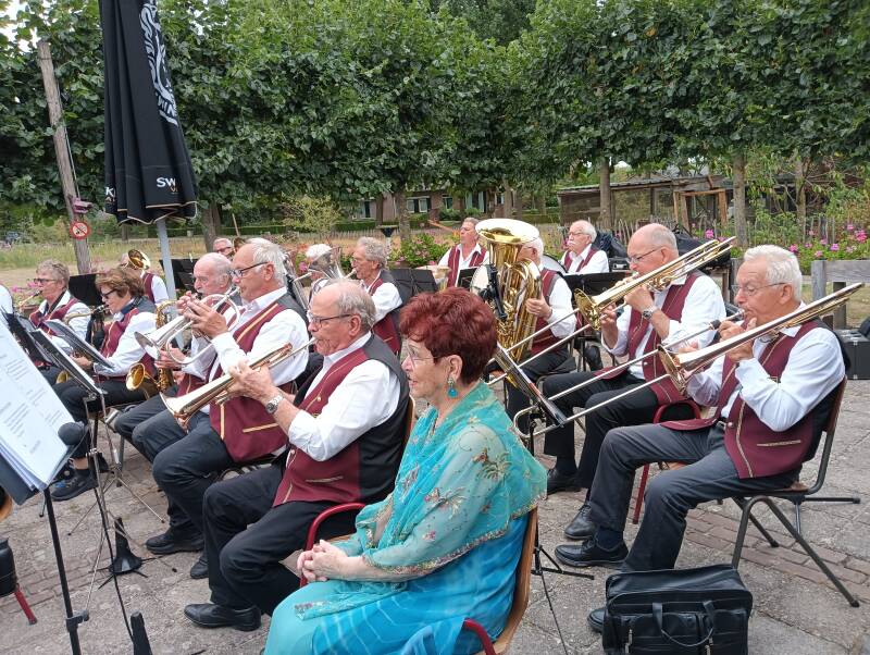 Een optreden onder zeer warme omstandigheden met vele luisteraars op het terras. Onze vaste dirigent Frans was op vakantie waardoor de leiding in handen was van zijn zwager Jos van de Rijt. Het was een prachtig optreden met Monique Trienekes als invaller op de bas.